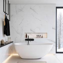 - PANNEAUX MURAUX SPÉCIAL SALLE DE BAIN - Conçues pour habiller les murs et parois de douche, ces dalles SPC effet marbre blanc apportent une touche élégante et lumineuse à votre intérieur.